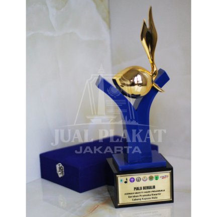 Plakat ini merupakan sebuah piala bergilir yang dirancang dengan desain modern dan elegan. Plakat ini memiliki dasar dan bodi Fiber berwarna biru tua, terbuat dari bahan fiber dengan bentuk yang unik logo Cikal Pramuka yang di finishing warna Emas mengkilat, yang memberikan kesan mewah dan prestisius. Kombinasi warna emas dan biru menciptakan kontras yang menarik dan berkelas.