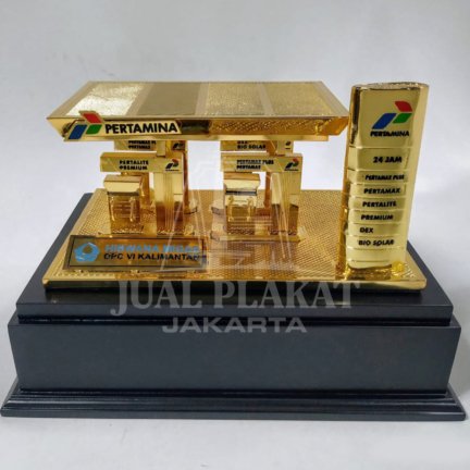 Hadirkan ikon bisnis energi Indonesia dengan miniatur Stasiun Pengisian Bahan Bakar Umum (SPBU) Pertamina yang dibuat sangat detail dan dilapisi finishing emas mewah. Ini adalah corporate gift atau penghargaan eksklusif yang melambangkan prestasi, jaringan luas, dan kemitraan strategis.