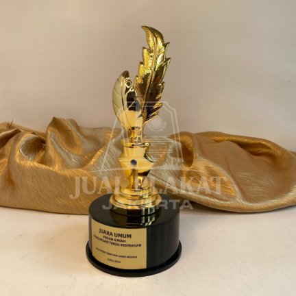 - Desain dan Makna: Bagian atas piala berbentuk seperti pena bulu (quill) yang sedang menulis, melambangkan ilmu pengetahuan, kreativitas, dan prestasi intelektual. Desain ini sangat cocok untuk acara ilmiah. Pena ini berdiri di atas basis timah yang juga berlapis emas, terpasang pada alas hitam yang kokoh.