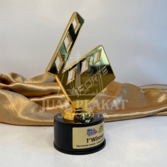 Trophy ini adalah simbol penghargaan yang sempurna untuk industri film, khususnya bagi pembuat film pendek. Dibuat dari timah dengan finishing emas mengkilap, trophy ini memancarkan kesan glamor dan pengakuan atas kreativitas sinematik. Desain Ikonik: Bagian atas trophy didesain dengan bentuk clapperboard yang khas—alat penting dalam produksi film. Desain ini secara langsung merepresentasikan dunia perfilman, menjadikannya…