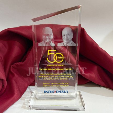 Abadikan momen spesial perusahaan Anda, Indorama, dengan plakat akrilik inovatif ini! Plakat ini memadukan dua teknik cetak canggih untuk hasil yang elegan dan tahan lama.