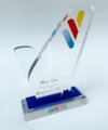 - Dudukan (Base): Desain dual-layer yang terdiri dari lapisan akrilik bening dan lapisan akrilik biru kobalt, menciptakan tampilan yang mewah dan berlapis. Bagian depan base dapat mencantumkan logo dan detail perusahaan (Wizhuri Business Centre).