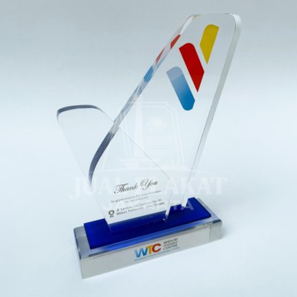 Sampaikan rasa terima kasih dengan plakat akrilik yang memiliki desain dinamis dan futuristik. Berbentuk sayap atau sirip yang melengkung, plakat ini memuat logo perusahaan Anda dengan warna cerah dan tulisan “Thank You” yang elegan. Dudukan dual-tone perpaduan akrilik bening dan biru memberikan kesan modern yang mewah. Plakat ini sangat ideal sebagai cenderamata kunjungan atau apresiasi kemitraan.