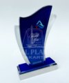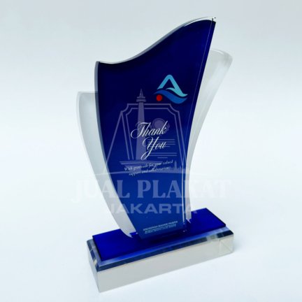 Plakat ini berdiri kokoh di atas dudukan akrilik bening dengan aksen biru gelap, siap diukir dengan nama penerima atau detail acara.