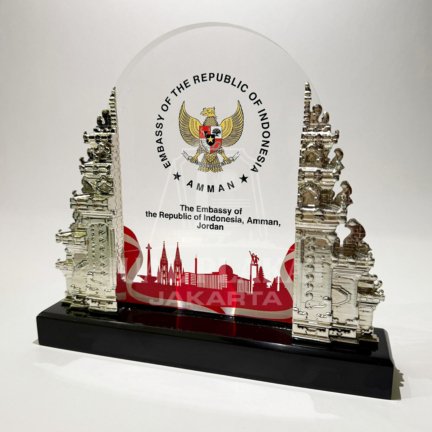 Sajikan kenang-kenangan yang mewakili hubungan baik antarnegara. Plakat ini memiliki desain unik yang memadukan gapura khas Indonesia (Candi) dengan latar belakang siluet kota Amman, Yordania. Terbuat dari akrilik bening yang elegan dan figur fiber yang kokoh, plakat ini sempurna sebagai cenderamata resmi dari Kedutaan Besar Republik Indonesia (KBRI) Amman untuk mempererat diplomasi dan kolaborasi.