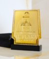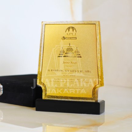 - Tampilan Mewah: Plakat ini berdiri kokoh di atas alas akrilik hitam yang padat dan tebal. Kontras antara emas berkilau, bingkai akrilik bening, dan alas hitam menciptakan plakat yang elegan dan menawan saat dipajang.
