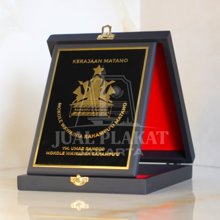 - Bahan Kombinasi Premium: Kotak plakat terbuat dari kayu solid berwarna hitam yang kokoh, memberikan kesan formal dan elegan. Bagian penutup dalamnya dilapisi plat kuningan sepuh emas.