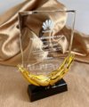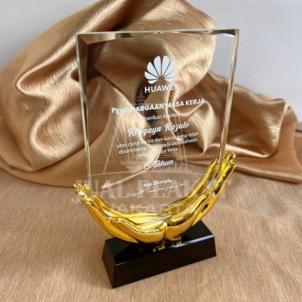 - Desain dan Bahan: Plakat ini memiliki desain yang sangat khas, di mana lempengan kristal bening berbentuk persegi panjang ditopang oleh sepasang tangan berwarna emas. Bagian tangan ini melambangkan apresiasi dan dukungan, seolah-olah sedang memegang erat sebuah pencapaian. Seluruh struktur ini berdiri kokoh di atas alas persegi berwarna hitam.