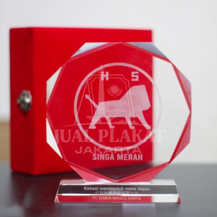 - Bentuk dan Warna: Bagian utama plakat memiliki bentuk oktagonal (segi delapan) yang khas, seluruhnya berwarna merah cerah. Warna merah ini memberikan kesan berani, kuat, dan penuh gairah. Bagian ini berdiri di atas alas kristal bening yang transparan dan minimalis.