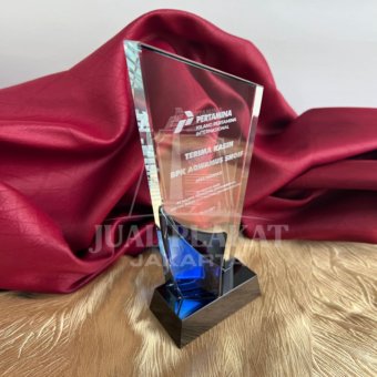 • Bahan Kristal Kualitas Tinggi: Terbuat dari kristal bening tebal yang memantulkan cahaya dengan indah. Plakat ini memiliki struktur multi-bagian yang menambah kesan artistik.