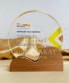 - Bahan Kombinasi: Plakat ini terbuat dari akrilik bening tebal berbentuk lingkaran yang menampilkan cetakan sertifikat penghargaan. Bagian alasnya menggunakan kayu solid dengan ukiran yang unik, memberikan sentuhan hangat dan alami.