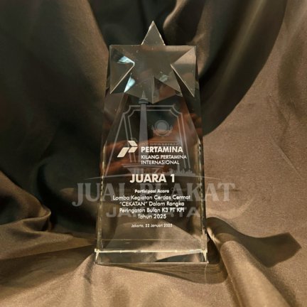 - Ukiran Laser Detail: Di bagian dalam kristal terdapat ukiran laser yang menampilkan logo Pertamina dan tulisan “JUARA 1”, serta detail acara “Lomba Kegiatan Cerdas Cermat”, semuanya dicetak dengan rapi dan jelas.