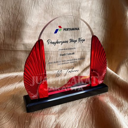- Bahan Akrilik Premium: Terbuat dari akrilik bening tebal yang kokoh. Bagian tengahnya menampilkan cetakan sertifikat penghargaan.