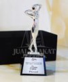• Tampilan Profesional: Patung ini bertumpu pada dasar plakat hitam yang kokoh dan glossy, memberikan kontras yang apik dan tampilan yang profesional.