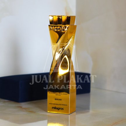 - Detail Menarik: Bagian atas trofi memiliki ukiran logo dan tulisan “MCDR” yang timbul, sementara bagian bawahnya dilengkapi plakat dengan nama penerima, “BIKIAN”, dan detail penghargaan “DIRECTOR QUALIFIED REWARD”.