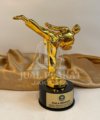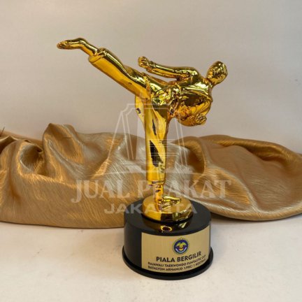 - Desain Dinamis: Bagian atas trophy menampilkan figurin seorang atlet Taekwondo dalam posisi tendangan samping yang kuat dan akurat. Detail anatomi dan gerakan digambarkan dengan sangat baik, menangkap esensi kekuatan dan kelincahan atlet. Warna emas metalik yang berkilauan menambah kesan dinamis dan kemenangan.